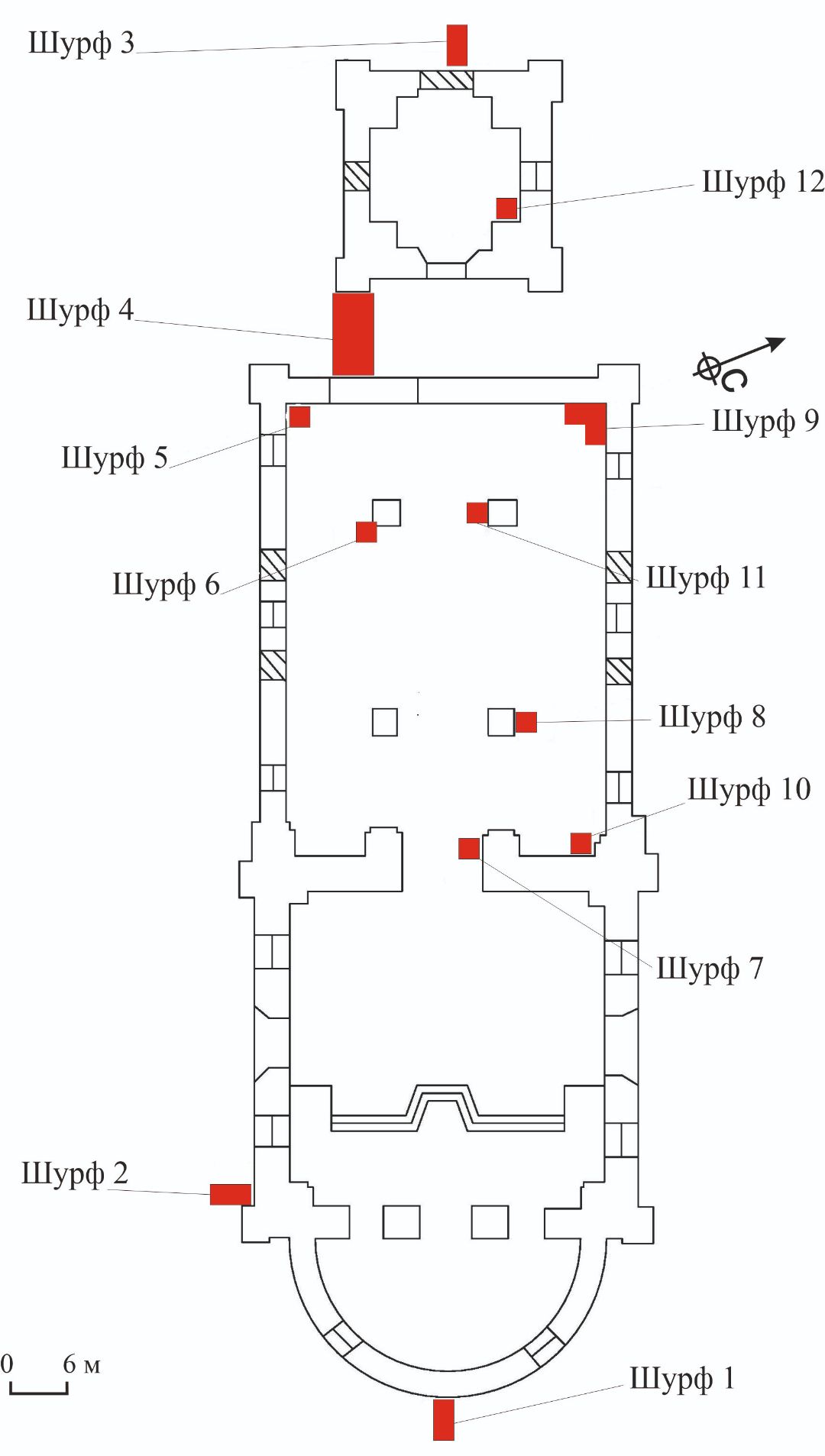 Всего заложено 12 архитектурно-археологических шурфов: четыре с внешней стороны церкви, семь внутри основного здания и один в колокольне, сейчас отстоящей от здания церкви (соединяющий их проход разрушен в XX веке).
